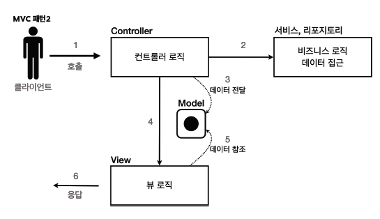 - 컨트롤러 : HTTP 요청을 받아서 파라미터를 검증하고, 비즈니스 로직을 실행한다. 그리고 뷰에 전달할 결과 데이터를 조회해서 모델에 담는다.
